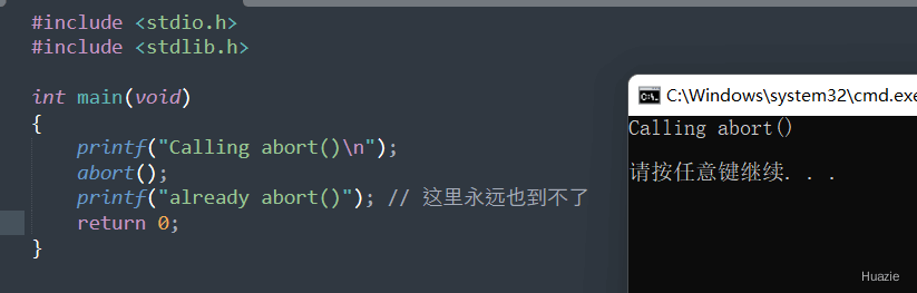 注意: abort() 函数用于终止当前程序的执行。当程序调用 abort() 函数时,它会立即退出,并生成一个错误信号,通知操作系统程序非正常终止。如果程序已经打开了一些文件或句柄,但尚未关闭它们,则这些资源可能无法被正确释放。
