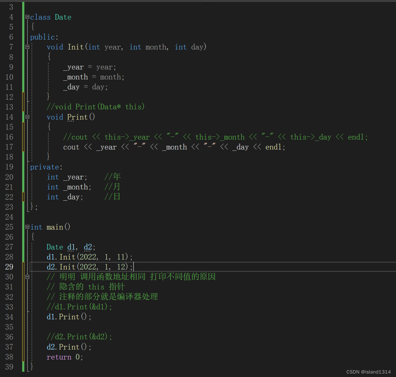 }Date类中有 Init 与 Print 两个成员函数,函数体中没有关于不同对象的区分,那当d1调用 Init 函 数时,该函数是如何知道应该设置d1对象,而不是设置d2对象呢?