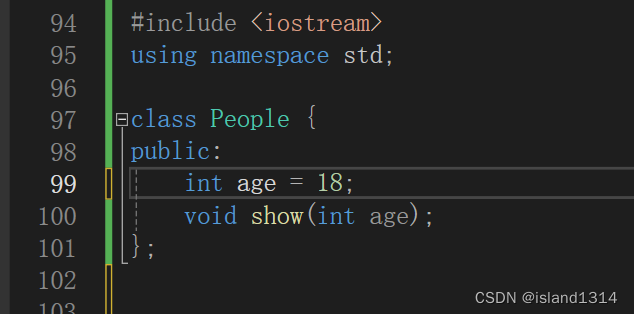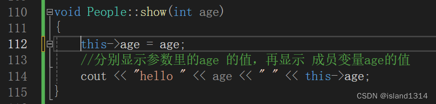 b.书写类的内容,这里的show函数,分别显示参数里的age的值,再显示成员变量age的值