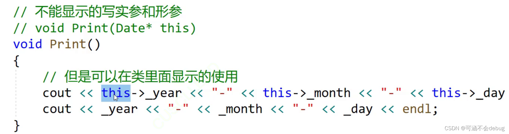 不能显示写出this相关实参和形参,但是可以在类里面显示使用