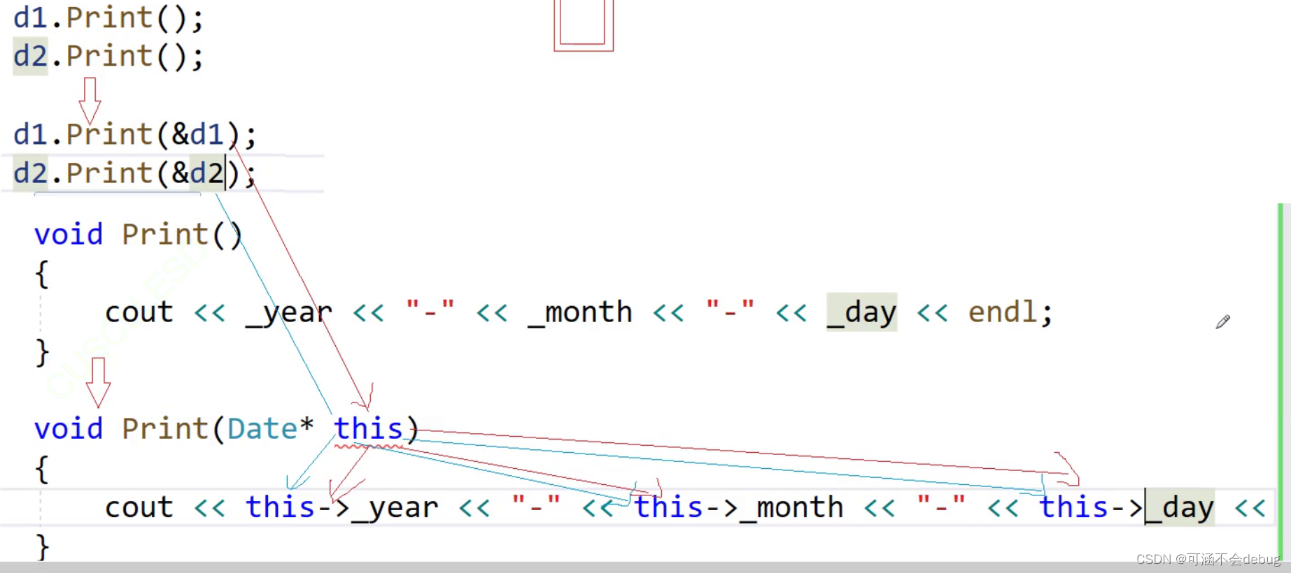 对于上述类,有这样的一个问题: Date类中有 Init 与 Print 两个成员函数,函数体中没有关于不同对象的区分,那当d1调用 Init 函数时,该函数是如何知道应该设置d1对象,而不是设置d2对象呢?