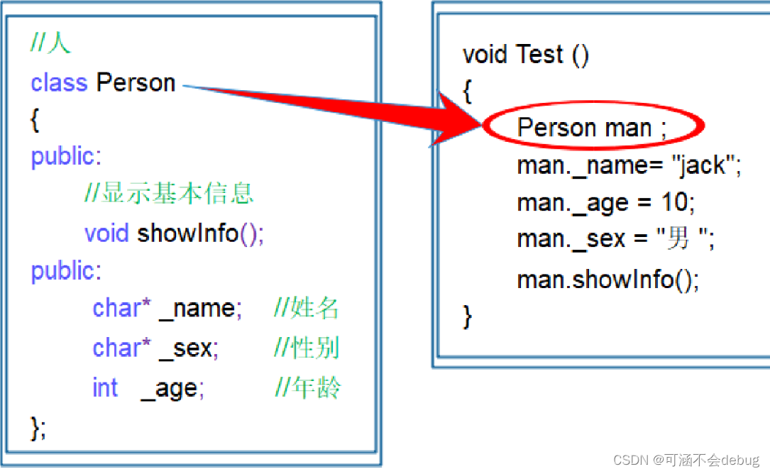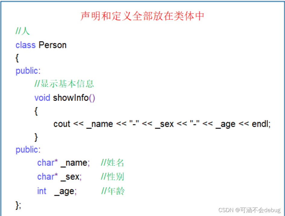 class为定义类的关键字,ClassName为类的名字,{}中为类的主体,注意类定义结束时后面分号不能省略。 类体中内容称为类的成员: