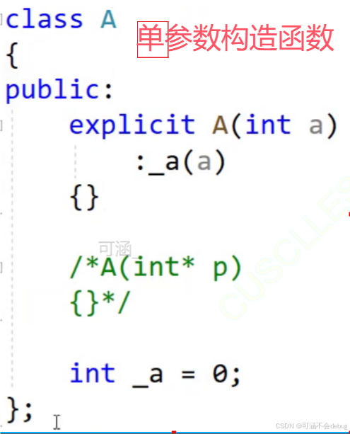 注意这里的 A aa3 = 3 就是将内置类型隐式转换为了自定义类型,原理是自定义类型中包含了int单参数构造函数(支持传一个参数或者多参数带缺省也可以)的支持,如果不想让转换发生,构造函数加explicit关键字。