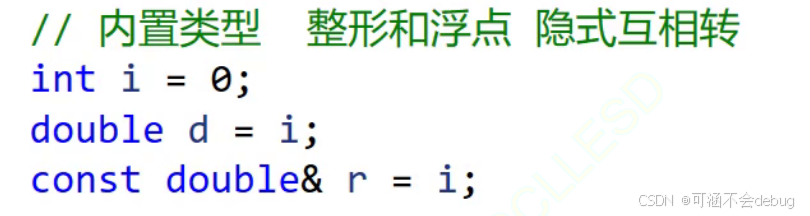 注意这里引用需要加上const,但赋值不需要加。因为隐式类型转换中间会产生临时变量,而临时变量具有常性!这里的引用是将临时变量引用给了r,具有常性,所以要加上const;而赋值是将临时变量直接赋值给d,不需要加上const!