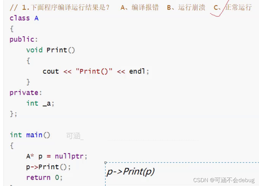 首先p是一个指针,并且是空指针,注意当指针定义的对象时,就需要用->来访问成员变量。