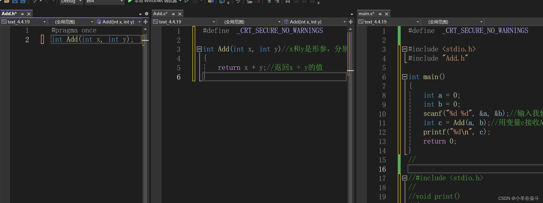 我们在源文件下新建一个 Add.c 文件 ,头文件下新建一个 Add.h 文件,我们将函数的定义(即函数的实现)放在 Add.c 文件下,将函数的声明放在 Add.h 文件下,再在 main.c 文件中包含头文件 “Add.h”(我们自己定义的头文件用双引号)就完成了。