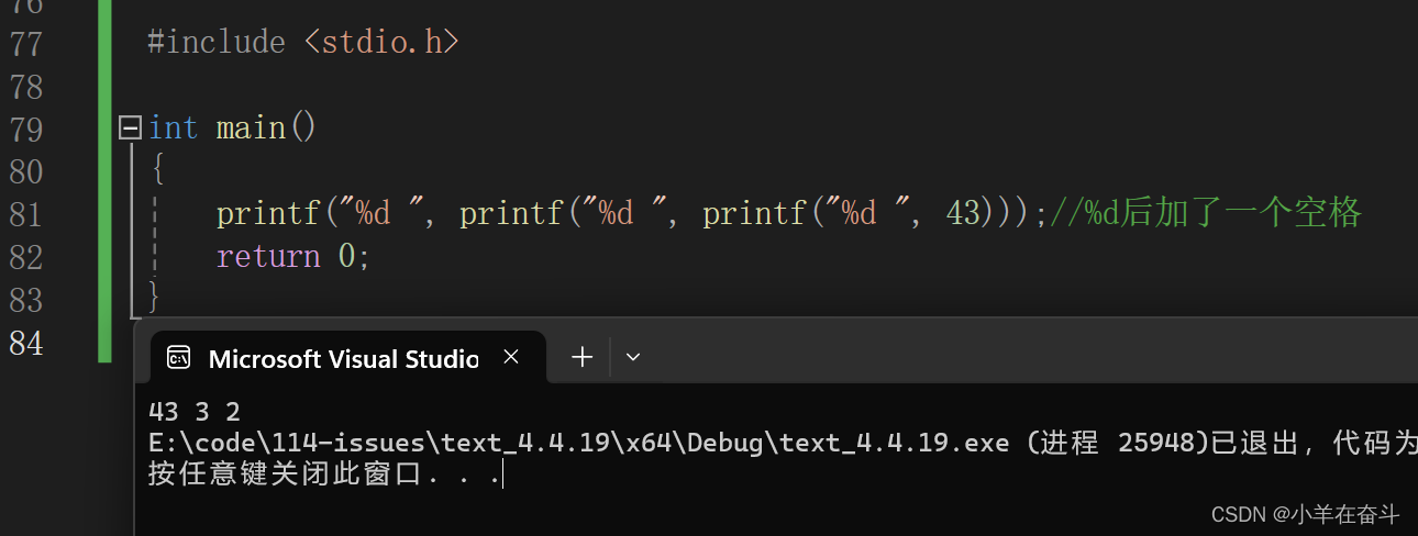 这里我们先补充一个点,我们最熟悉的 printf()函数其实是有返回值的,其返回值为打印字符的个数。知道了这个我们再来猜一下上面代码的执行结果是什么?