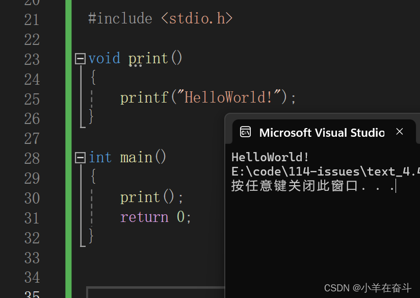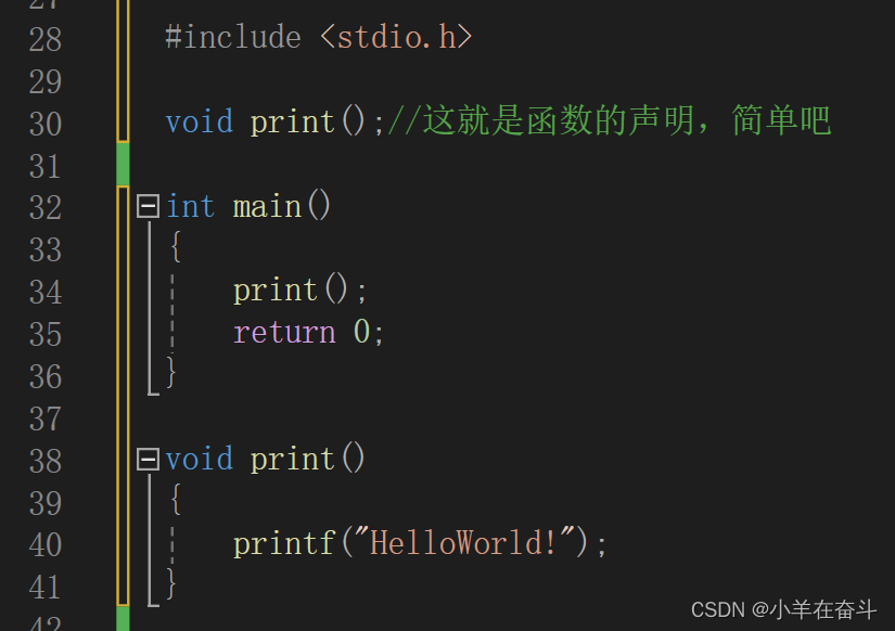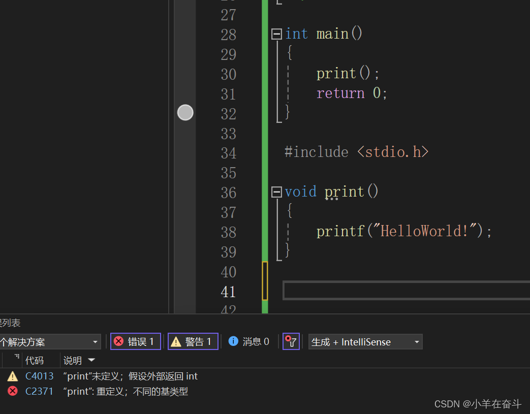 是因为编译器在编译时,会从上到下扫描代码,当扫描到主函数中的 print()函数时,由于编译器在这之前还未见过这个函数,所以就报了函数未定义。那如果我们就想将自定义函数放在主函数后呢?其实也是有办法的,这时候就用到了函数声明。