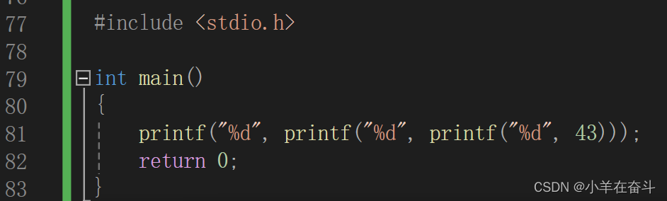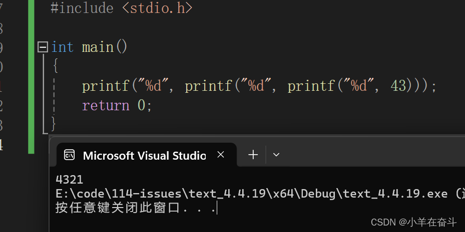 想必聪明的各位已经计算出了结果。首先最里面的 printf()打印了43两个字符,所以返回2;次外面的 printf()打印2一个字符,所以返回1,再最外面的 printf()打印1,所以最终打印出了4321。