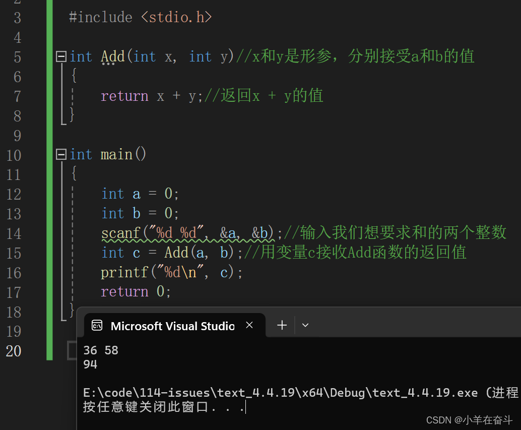 我们来写一个简单的加法函数,完成两个整型变量的加法操作: