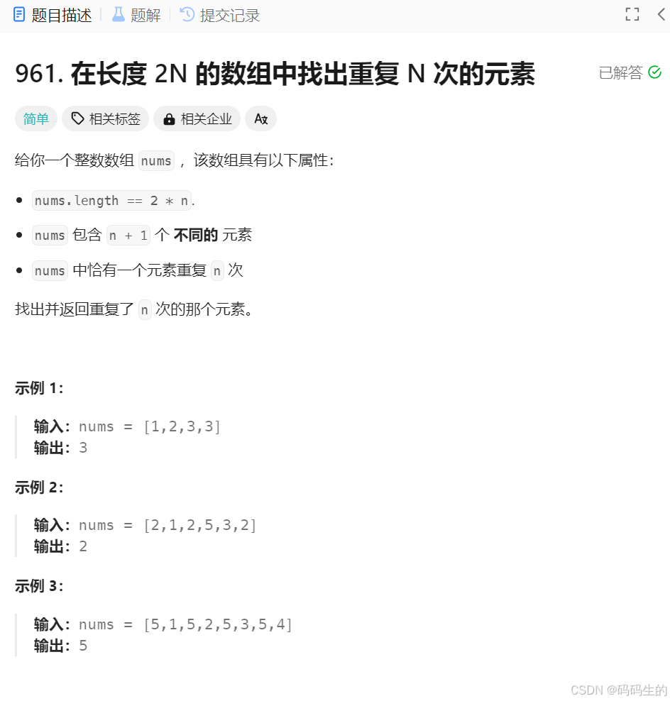 https://leetcode.cn/problems/n-repeated-element-in-size-2n-array/description/
