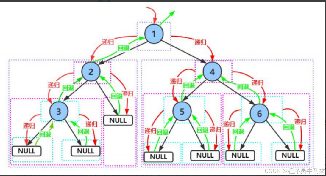 在遍历二叉树时,如果没有进行某种约定,每个人都按照自己的方式遍历,得出的结果就比较混乱,如果按 照某种规则进行约定,则每个人对于同一棵树的遍历结果肯定是相同的。如果N代表根节点,L代表根节点的 左子树,R代表根节点的右子树,则根据遍历根节点的先后次序有以下遍历方式: NLR:前序遍历(Preorder Traversal 亦称先序遍历)——访问根结点—>根的左子树—>根的右子树。 LNR:中序遍历(Inorder Traversal)——根的左子树—>根节点—>根的右子树。 LRN:后序遍历(Postorder Traversal)——根的左子树—>根的右子树—>根节点。 下面主要分析前序递归遍历,中序与后序图解类似,