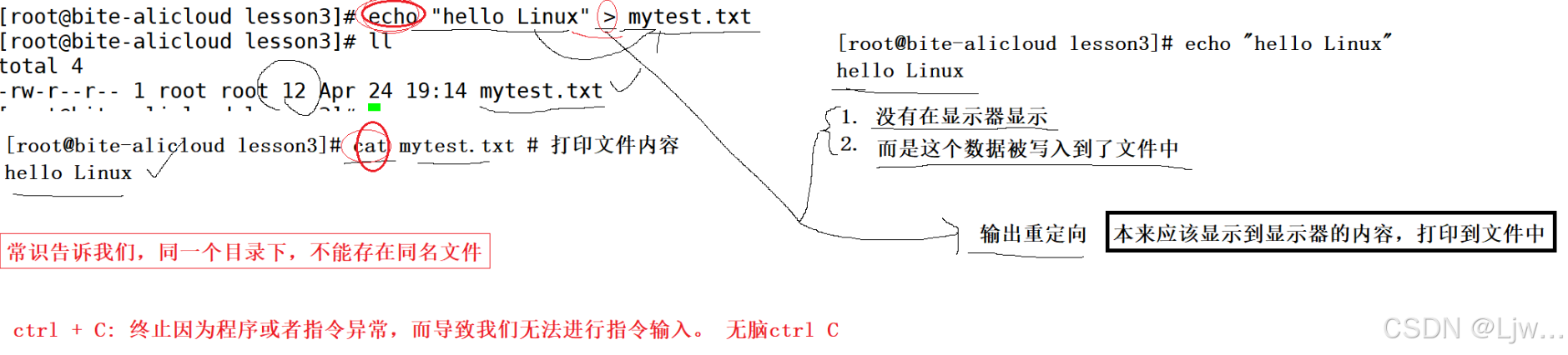 echo "hello" > mytest.txt,1、没有在显示器显示。2、这个数据被写入了文件中