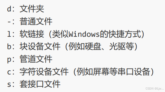 注意:d目录文件,-:普通文件,文件,可执行程序,库基本属于普通文件,b磁盘文件,c:键盘、显示器文件等等,p用来通信的