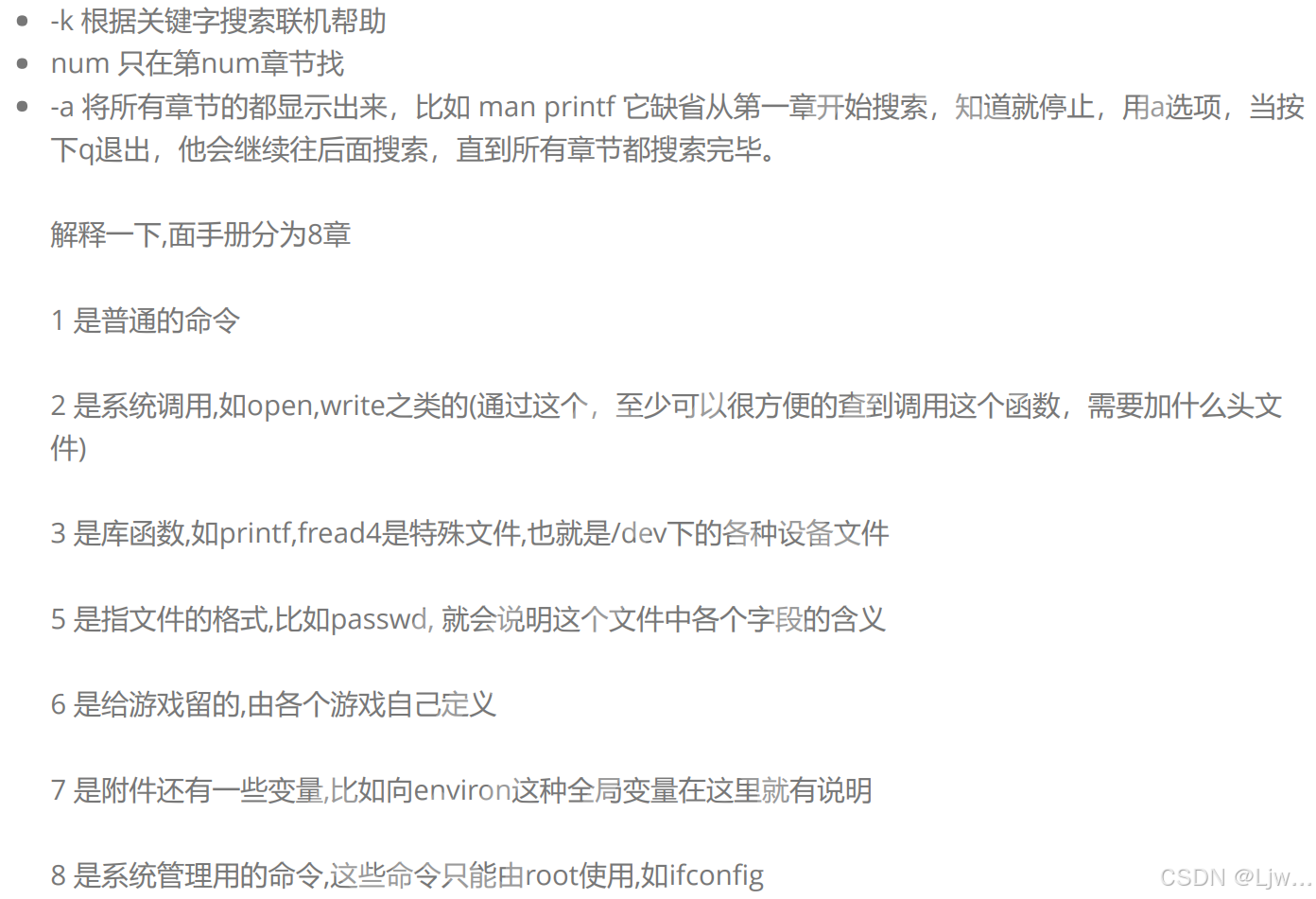 总的来说,man命令的1号手册、2号手册和3号手册分别对应用户命令、系统调用和库函数的手册页,它们为Linux用户、程序员和系统管理员提供了丰富的参考信息和帮助。通过使用man命令,用户可以快速查找和学习如何在Linux系统中使用各种命令、进行系统编程和管理。