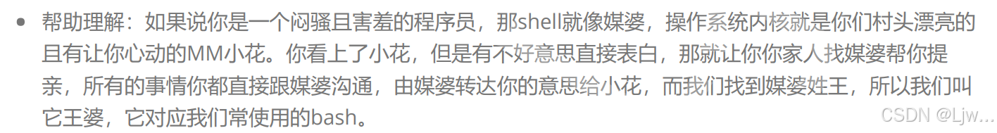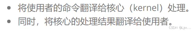 Linux严格意义上说的是一个操作系统,我们称之为“核心(kernel)“ ,但我们一般用户,不能直接使用kernel。而是通过kernel的“外壳”程序,也就是所谓的shell,来与kernel沟通。如何理解?为什么不能直接使用kernel?