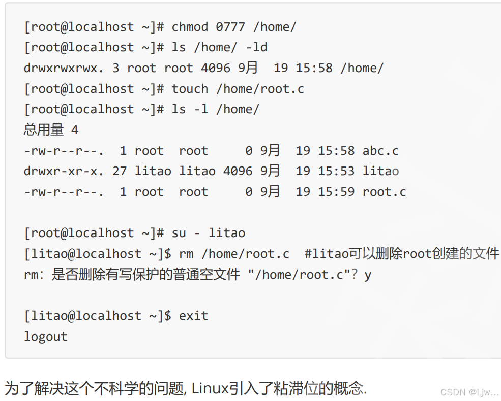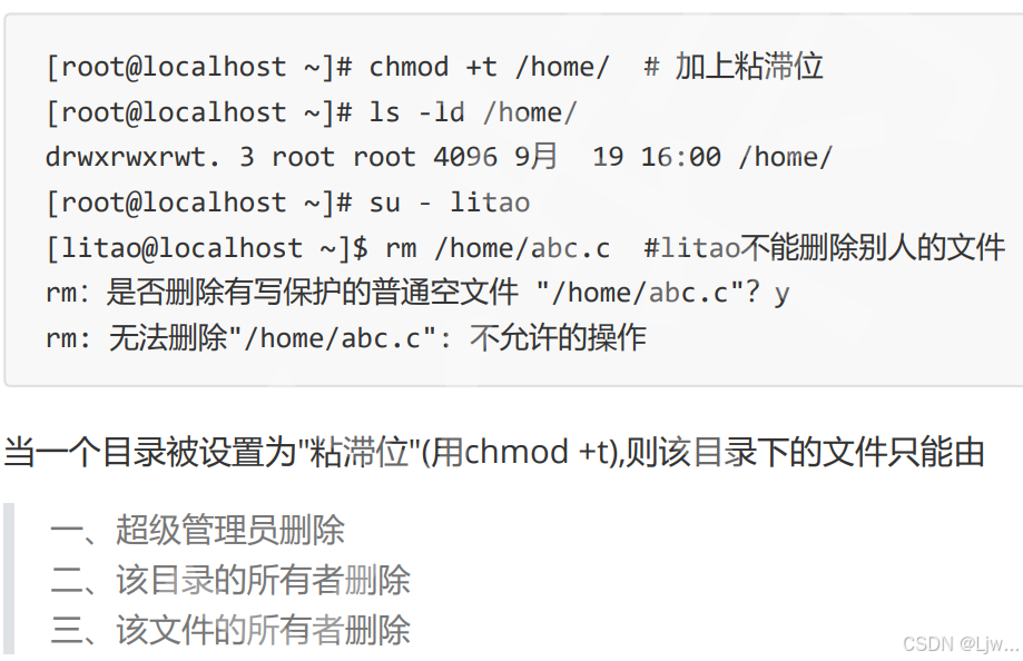 给目录设置,一般是共享目录,大家可以进行在目录进行各自文件的增删查改,只允许文件拥有者或root能删这个文件,其他人一概不允许,t是一种特殊的x权限