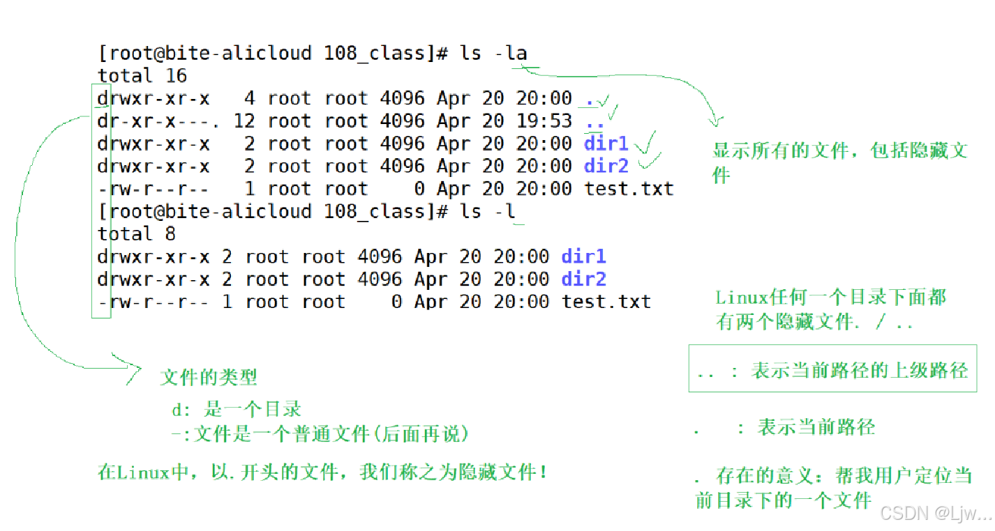 LL -La // LL -aL,顺序可以颠倒,显示出所有的文件,包括隐藏文件