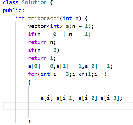 class Solution { public: int tribonacci(int n) { //处理一下边界问题 if (n == 0 || n == 1) return n; if (n == 2) return 1; vector<int> a(n + 1); a[0] = 0, a[1] = a[2] = 1; for (int i = 3; i <= n; i++) a[i] = a[i - 1] + a[i - 2] + a[i - 3]; return a[n]; } }
