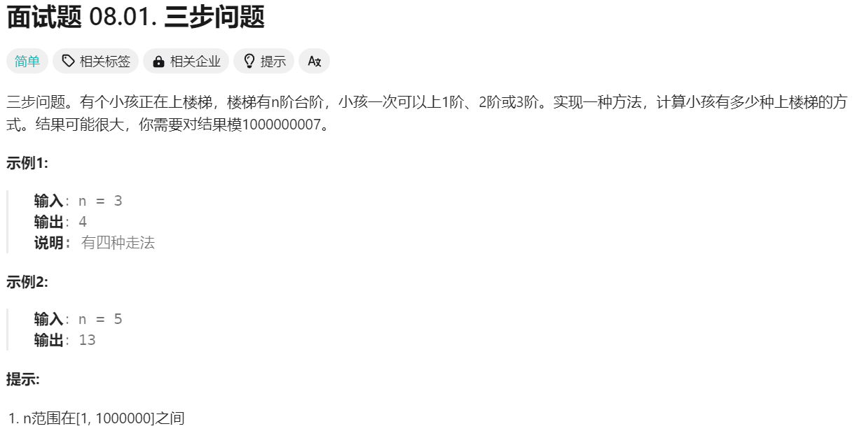 //题解 class Solution { public: int waysToStep(int n) { const int MOD = 1e9 + 7; if (n == 0 || n == 1 || n == 2) return n; if (n == 3) return 4; vector<int> dp(n + 1); dp[1] = 1, dp[2] = 2, dp[3] = 4; for (int i = 4; i <= n; i++) { //因为值很大,所以要对结果取模1e9 + 7 dp[i] = ((dp[i - 1] + dp[i - 2]) % MOD + dp[i - 3]) % MOD; } return dp[n]; } };