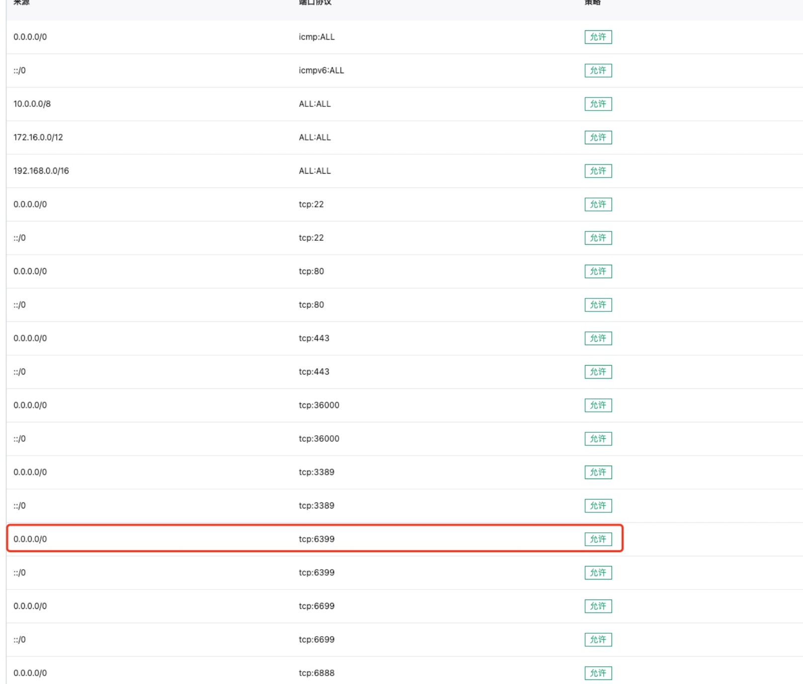 检查是否已经默认开放 6399端口,如下状态即是开放