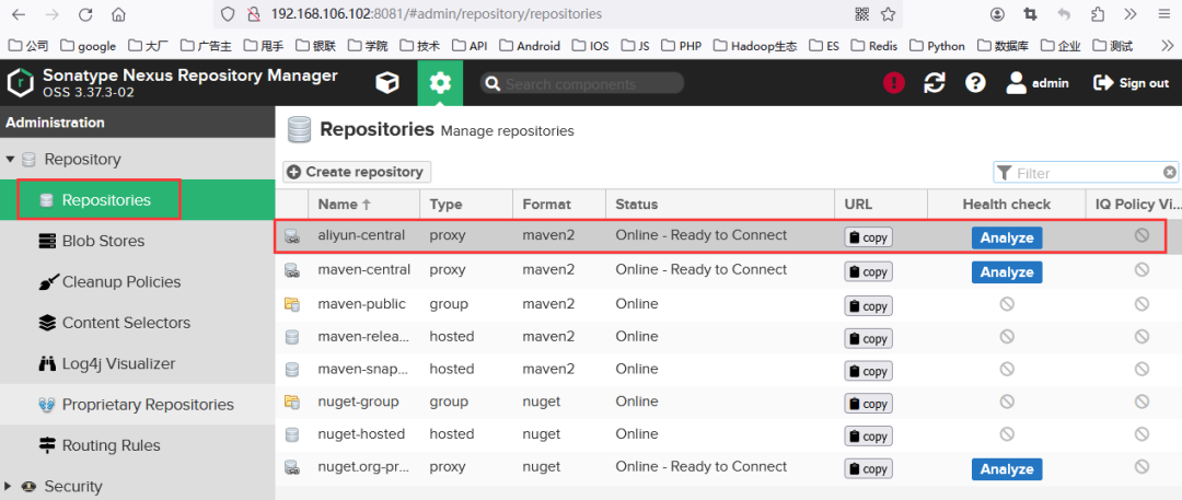 点击Create repository按钮后,就可以在Repositories列表中看到新配置的阿里云代理仓库了,如图16所示。