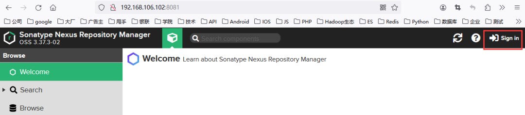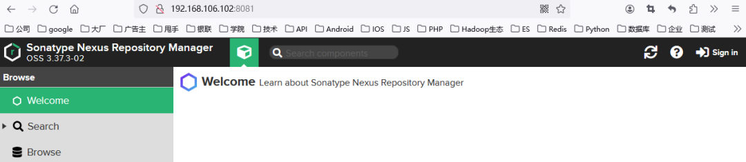 Nexus3容器启动时监听的端口和宿主机端口都是8081,所以,我们在浏览器地址栏输入http://192.168.106.102:8081打开Nexus3页面,如图1所示。