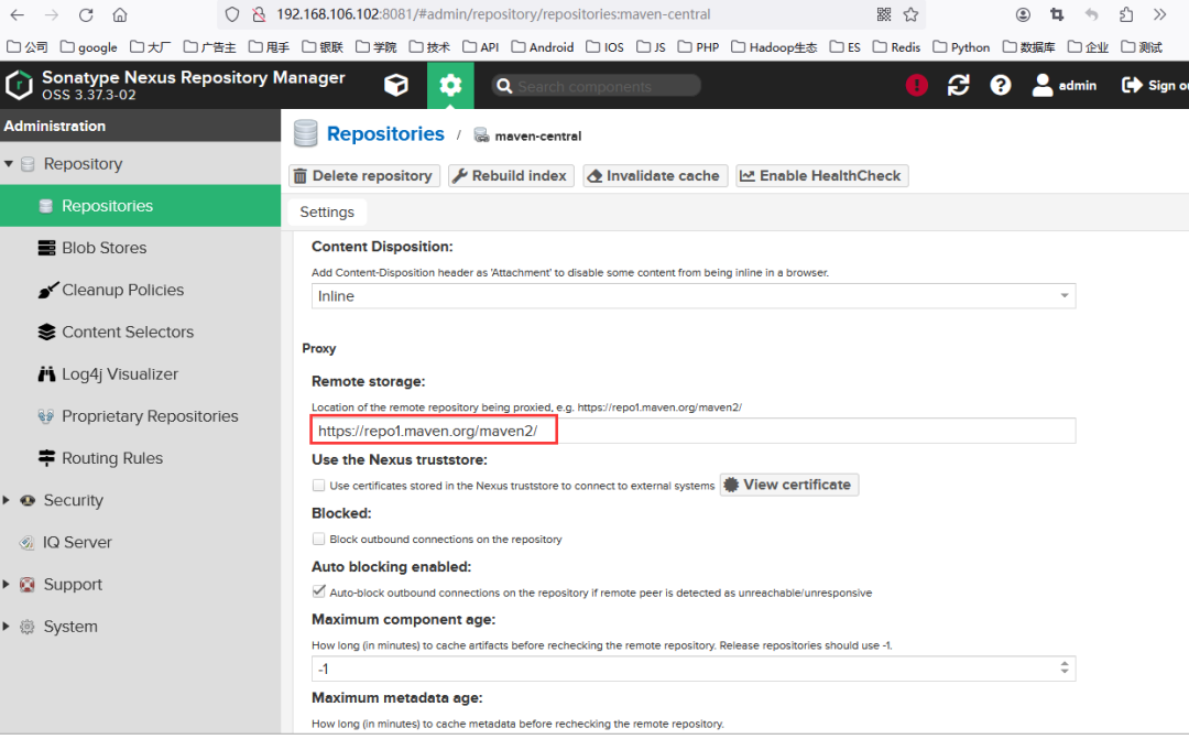 Nexus默认使用的远程仓库为maven-central,从这个远程仓库下载依赖很慢,经常连不上,如图10所示。
