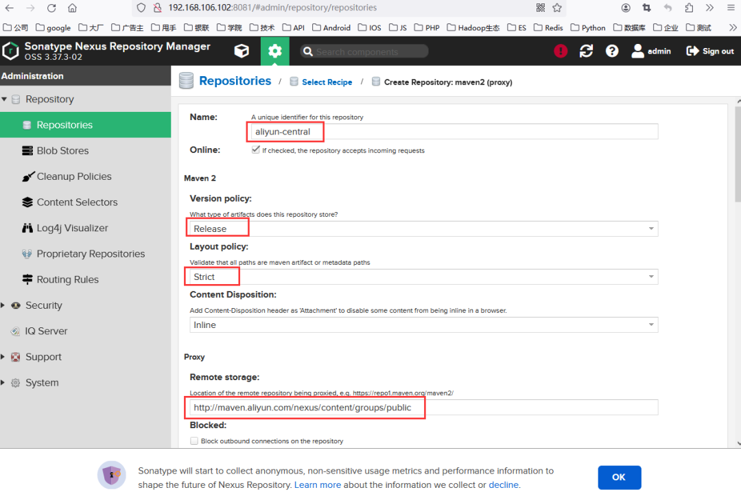 点击选则maven2(proxy)类型后,进入配置远程代理仓库的页面,如图14所示。