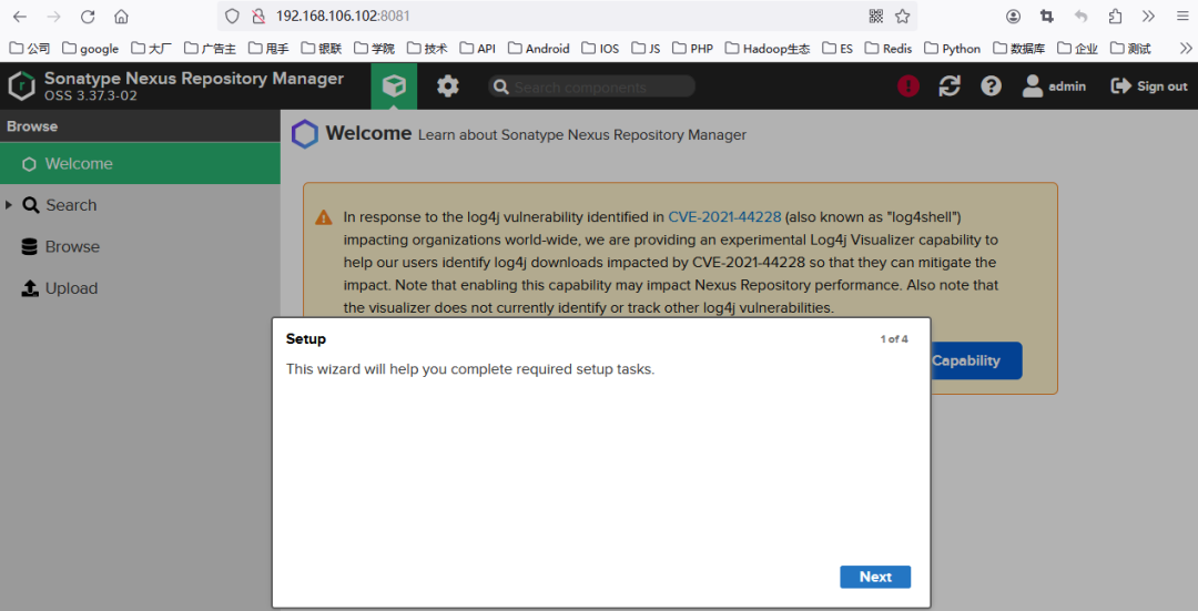 此时,我们就查看到登录Nexus3的admin账号的密码为517842df-1a2d-49c9-b4c3-b9ad4cf0fe00,将admin账号和对应的密码输入到图3所示的提示框中,即可登录Nexus3,如图5所示。