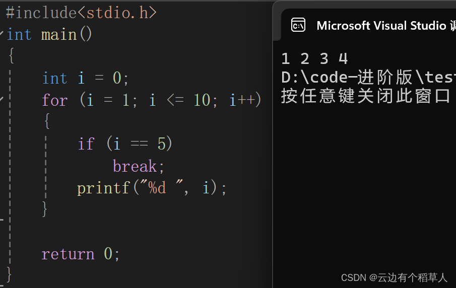 其实和 while 循环中的 break 一样,for 循环中的 break 也是用来终止循环的,不管循环还需要循环多少次,只要执行到了 break ,循环就彻底终止,上代码: