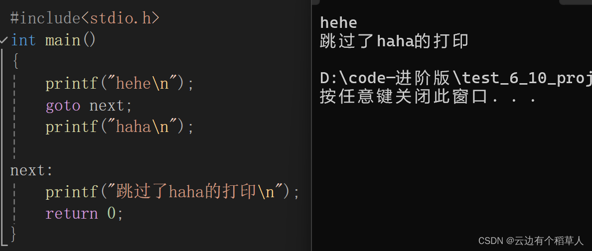 C语言提供了一种非常好的语法,goto 语句可以实现在同一个函数内跳转到设置好的标号处。