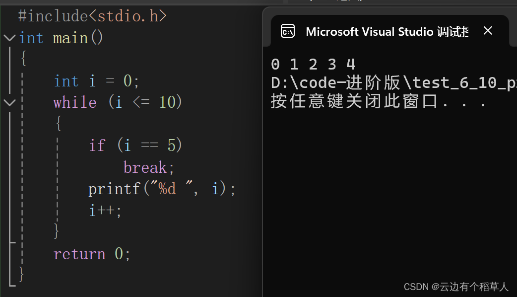 如结果显示,打印到5就停止了,不再打印,终止循环了。