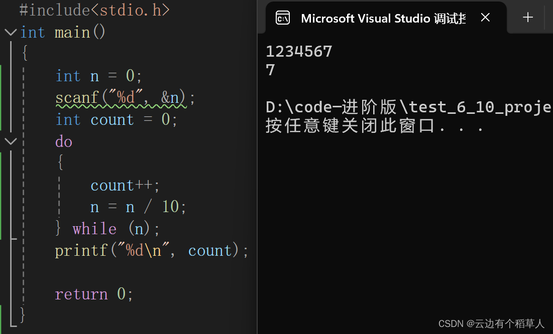 这里并非必须使用 do-while 语句,但是这个代码就比较适合使用 do-while 循环,因为 n 即使是0,也是1位数,要统计位数的。