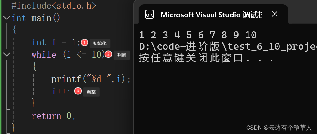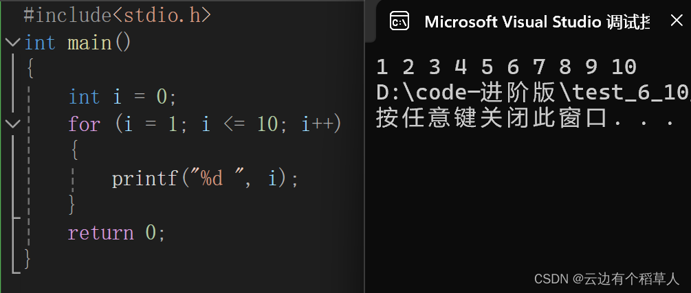 整个循环过程中,表达式1初始化部分只被执行一次,剩下的就是表达式2、循环语句、表达式3在循环。(留意,后面会用)