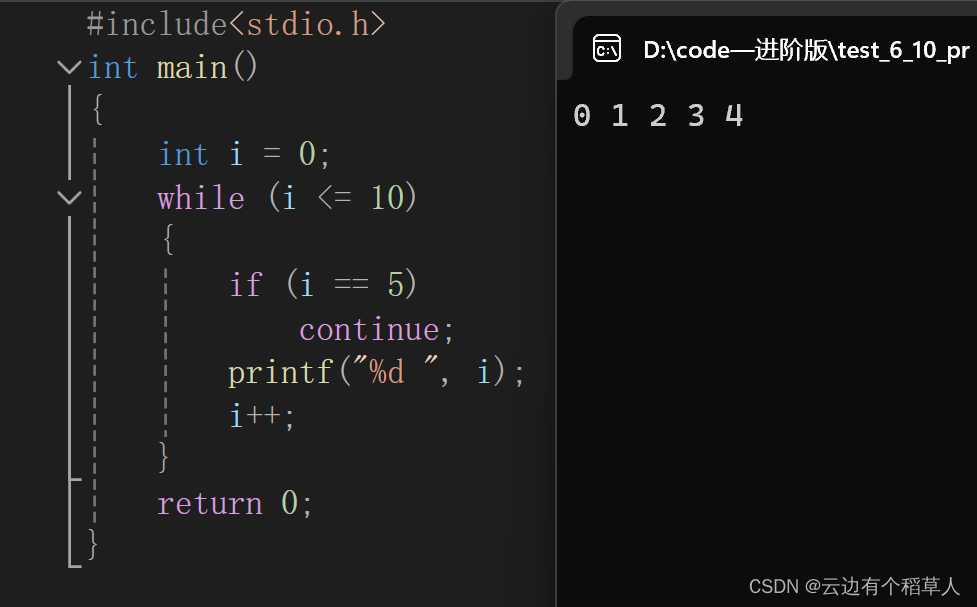 当 i =5 后,就执行 continue ,直接跳过 continue 的代码,去循环的判断的地方,因为跳过了 i++,所以 i 就一直为5,程序进入死循环。