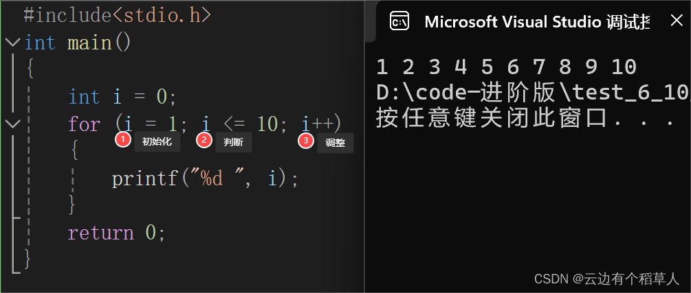 执行表达式1初始化循环变量——>执行表达式2的判断部分,表达式2的结果如果是0,则循环结束,非0,则执行循环语句,循环语句结束之后——>执行表达式3,调整循环变量——>再去判断表达式2,看表达式2的结果,决定循环是否继续。
