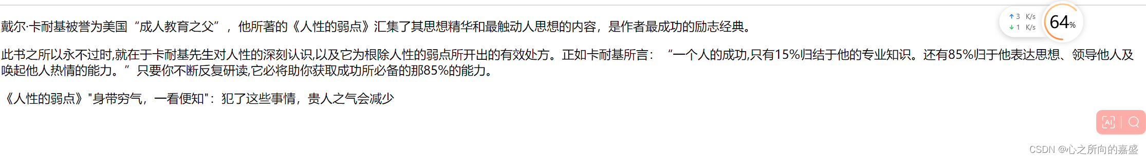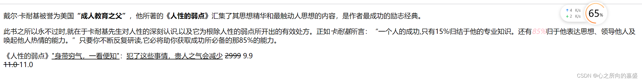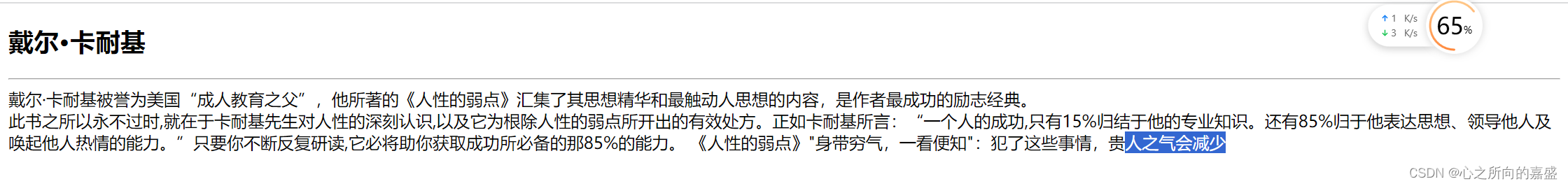 <p>此书之所以永不过时,就在于卡耐基先生对人性的深刻认识,以及它为根除人性的弱点所开出的有效处方。正如<em>卡耐基</em>所言:“一个人的成功,只有15%归结于他的专业知识。还有<i