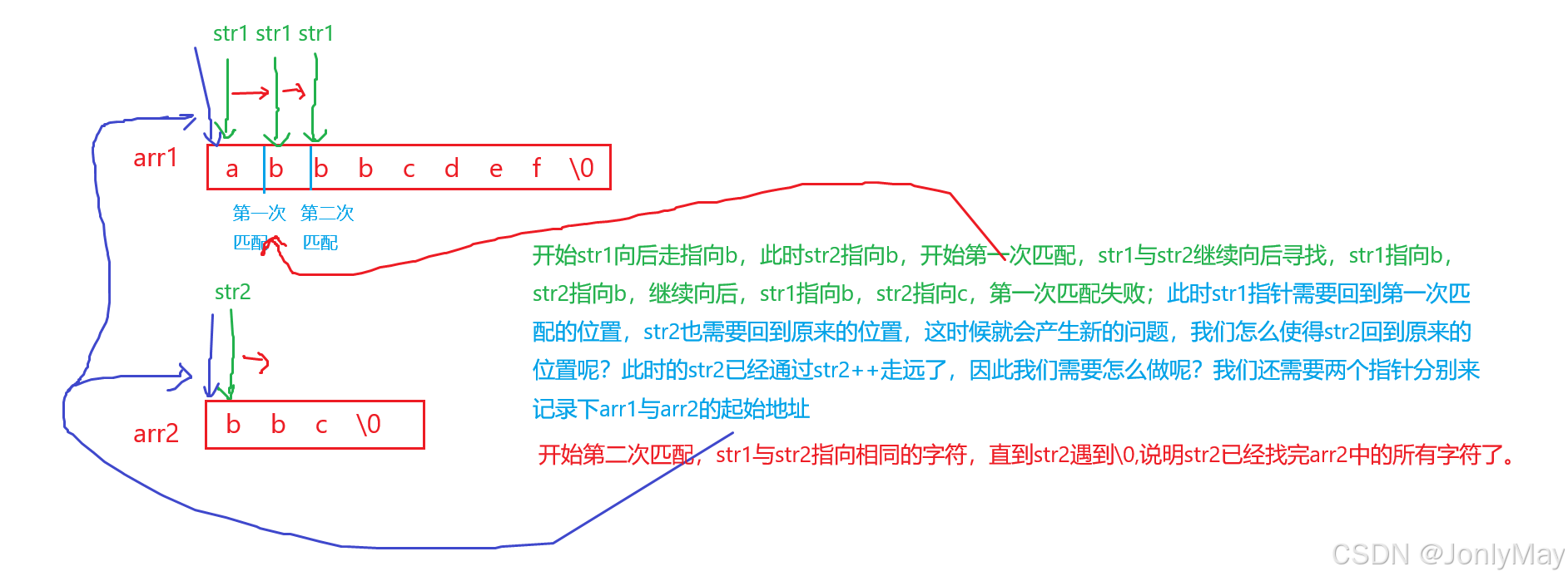 const char* cur = str1;//cur指针记可能的开始匹配的位置