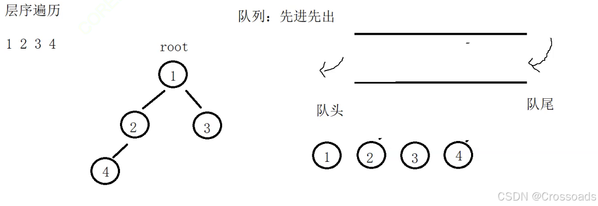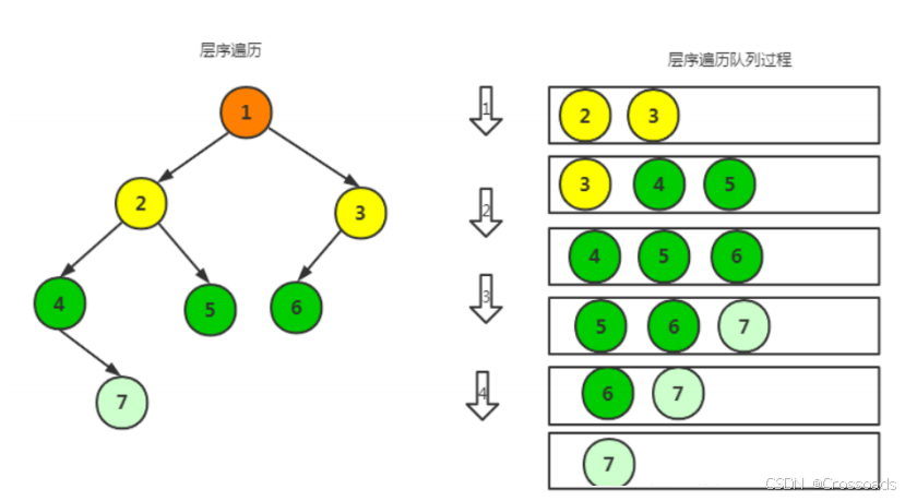 画图分析:在这里我们先让根节点(1)入队列,然后开始出队列。在出队列的同时,将它的左右孩子(2)、(3)分别入队列,以此类推,然后在(2)开始出队列的时候,将(2)的左右孩子分别入队列。这样就可以依次得到每一层结点了