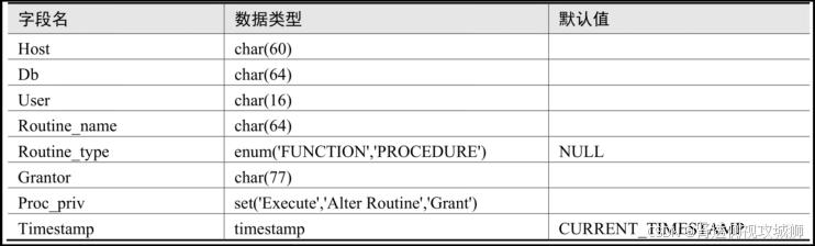 procs_priv表可以对存储过程和存储函数设置操作权限 ,表结构如图: