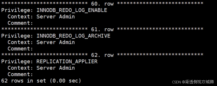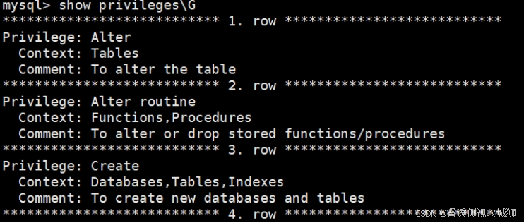 上述语句中privileges代表权限的名称,多个权限以逗号隔开。可使用SHOW语句查询权限名称,下图列出了部分权限列表。
