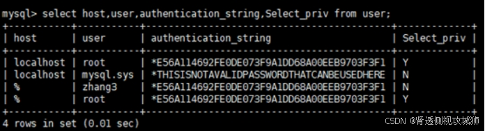 SELECT host,user,authentication_string,select_priv,insert_priv,drop_priv FROM mysql.user;