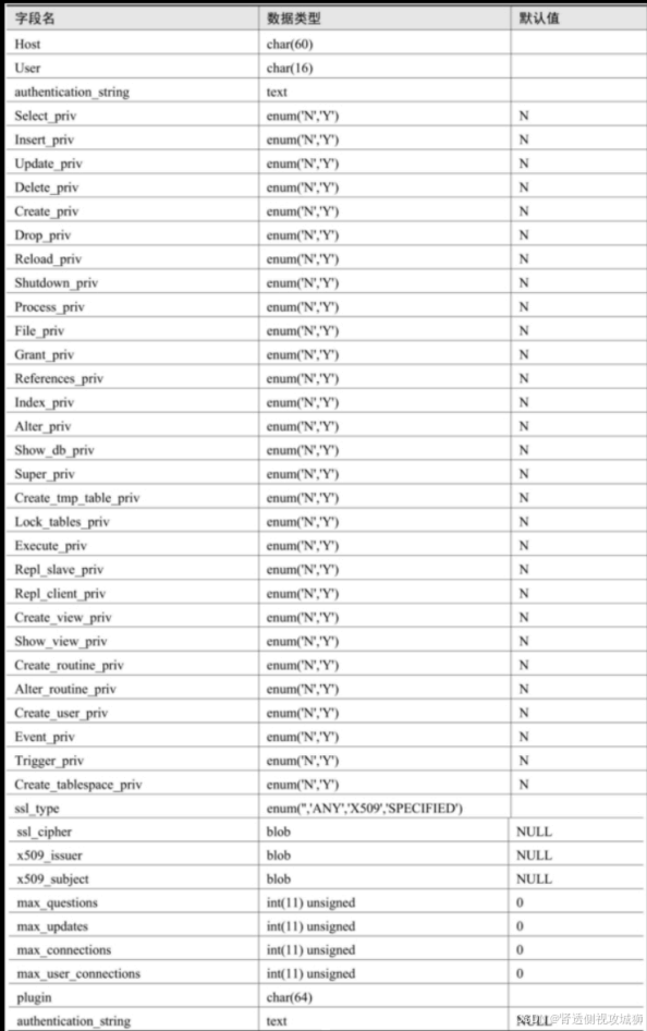 Shutdown_priv字段 | 表示是否拥有停止MySQL服务的权限 |