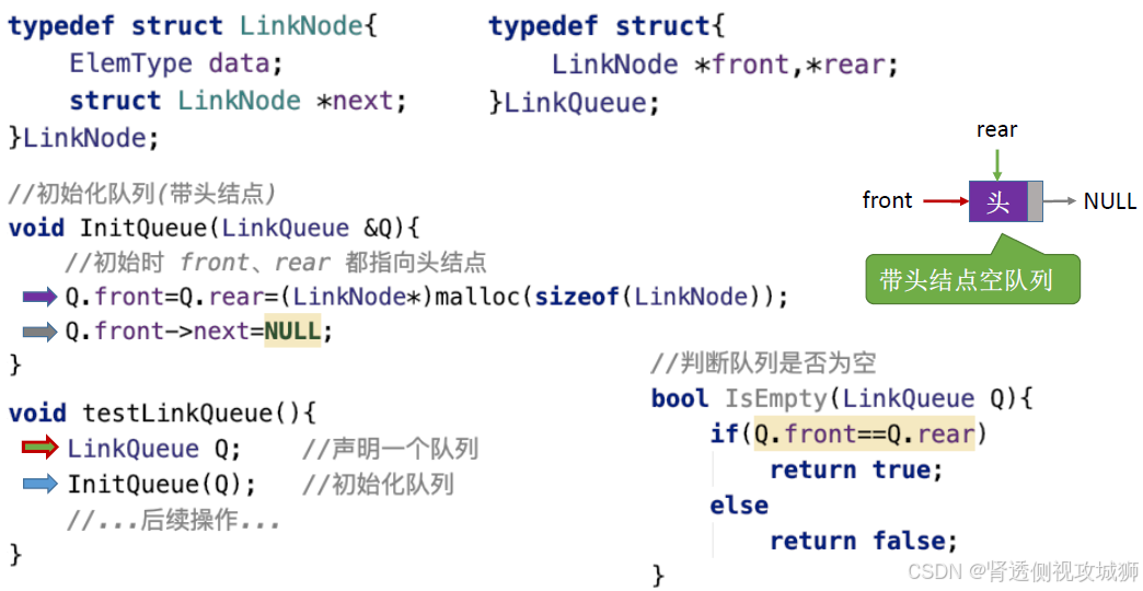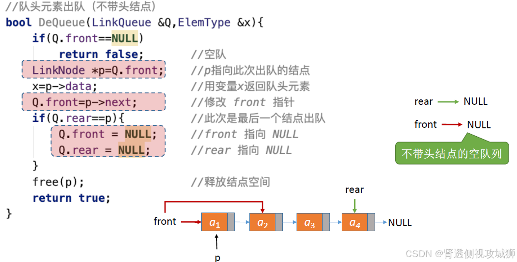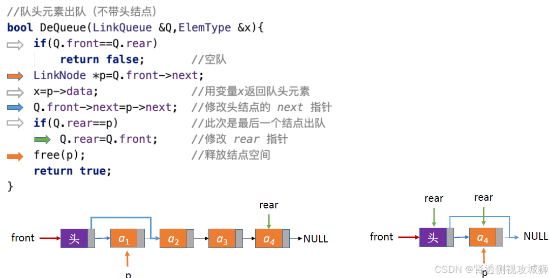 LinkNode *p = Q.front->next; //p指针指向即将删除的结点 (头结点所指向的结点)