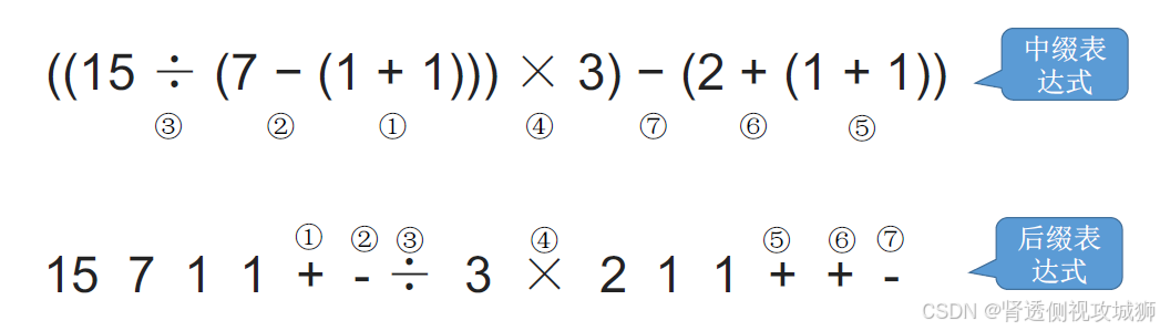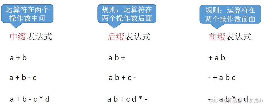 算数表达式: 由三个部分组成:操作数、运算符、界限符 我们平时写的算术表达式都是中缀表达式 如何可以不用界限符也能无歧义地表达运算顺序 Reverse Polish notation(逆波兰表达式=后缀表达式) Polish notation(波兰表达式=前缀表达式) 中缀、后缀、前缀表达式: