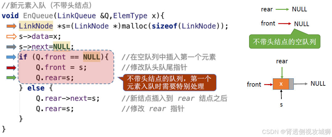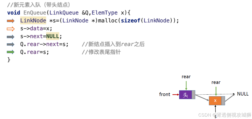Q.rear->next = s; //新结点插入到当前的rear之后