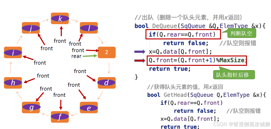 }实际上获取队头元素的值就是出队操作去掉队头指针后移的代码