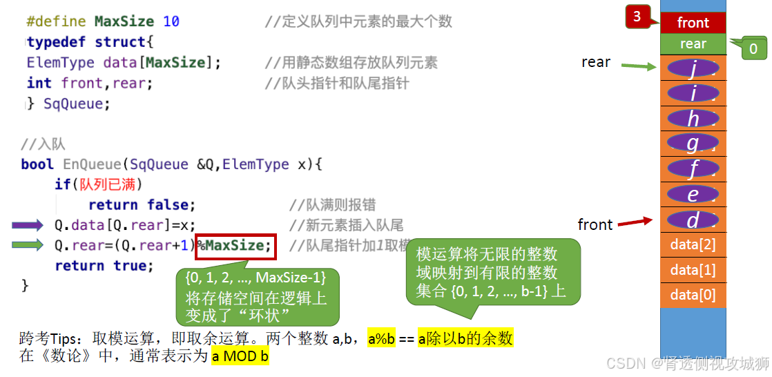 队尾指针进1:Q.rear = (Q.rear + 1) % MaxSize —— 队尾指针后移,当移到最后一个后,下次移动会到第一个位置