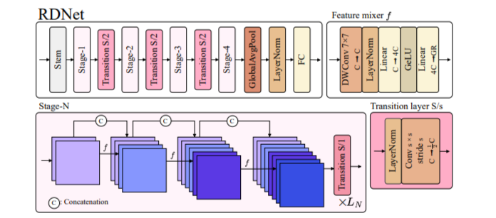 论文提出的模型主要基于对传统DenseNet架构的改进和复兴,通过一系列创新设计,旨在提升模型性能并优化其计算效率,提出了RDNet模型。该模型的主要特点和改进点: